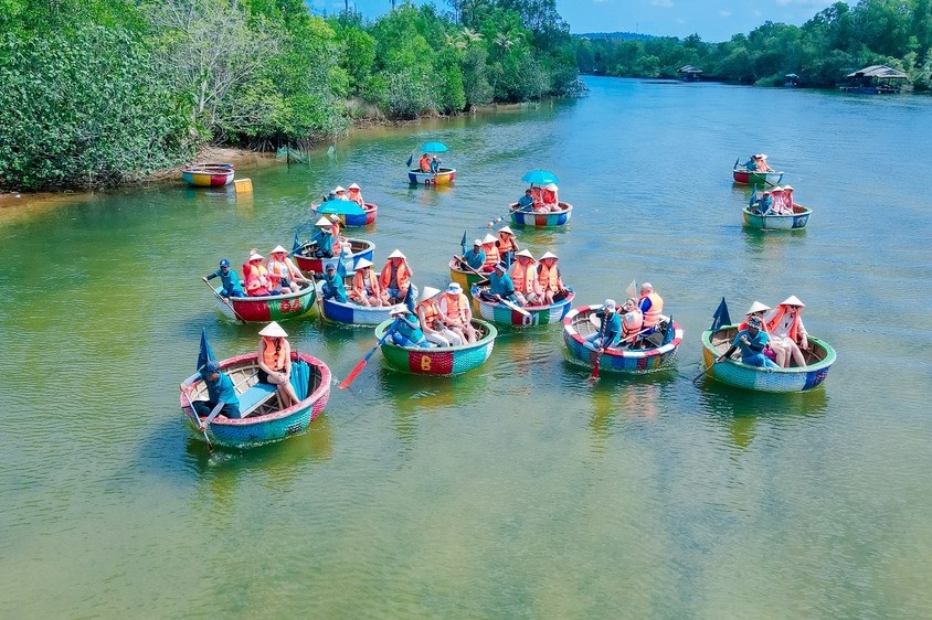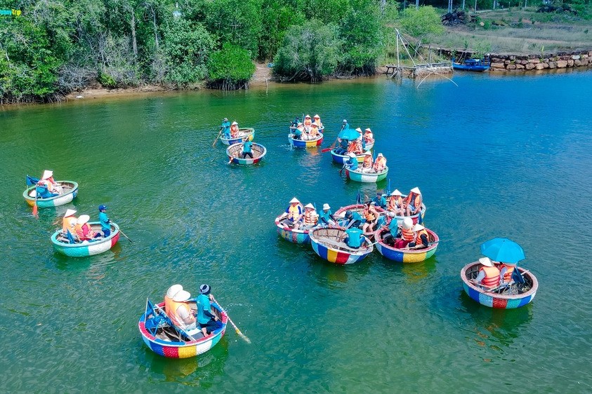 Hành trình tiếp tục bằng trải nghiệm chèo thuyền thúng trên sông Cửa Cạn, len lỏi qua rừng ngập mặn xanh mướt, cảm nhận không gian mộc mạc và khám phá đời sống của người dân địa phương. Tour đi kèm với bữa trưa hấp dẫn và đa dạng sẽ giúp bạn nạp lại năng lượng, sẵn sàng tận hưởng trọn vẹn chuyến đi.