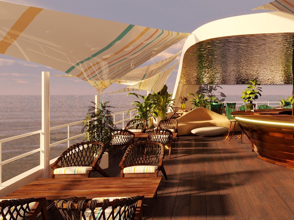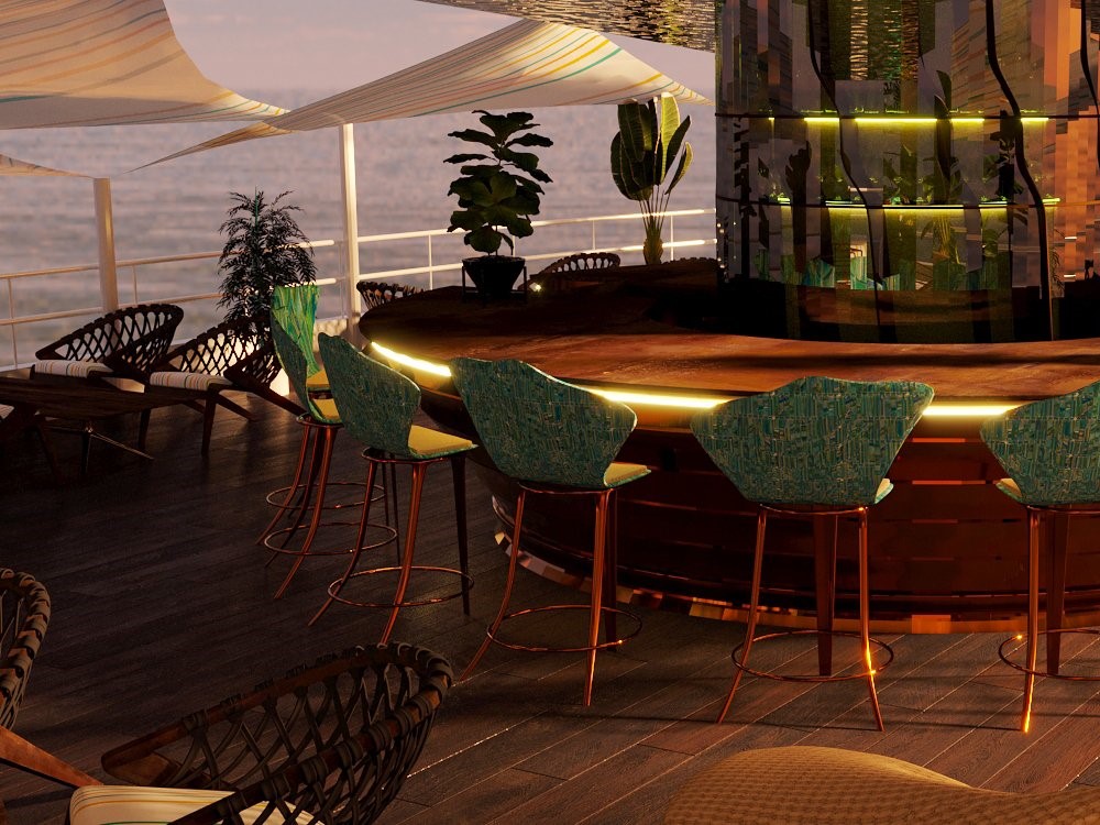 - Tầng 3 thiết kế quán bar view 360 độ để du khách thưởng ngoạn toàn cảnh của vùng biển Phú Quốc trong nhiều khoảnh khắc, check in sang chảnh giữa biển khơi và một không gian kiến trúc độc đáo. Ngoại vi của du thuyền là hệ thống cầu phao phục vụ khách tham quan check in và các môn dịch vụ vui chơi không kém phần hấp dẫn khác: thuyền thúng đáy kính tham quan rạn san hô, jeky, phao chuối…
